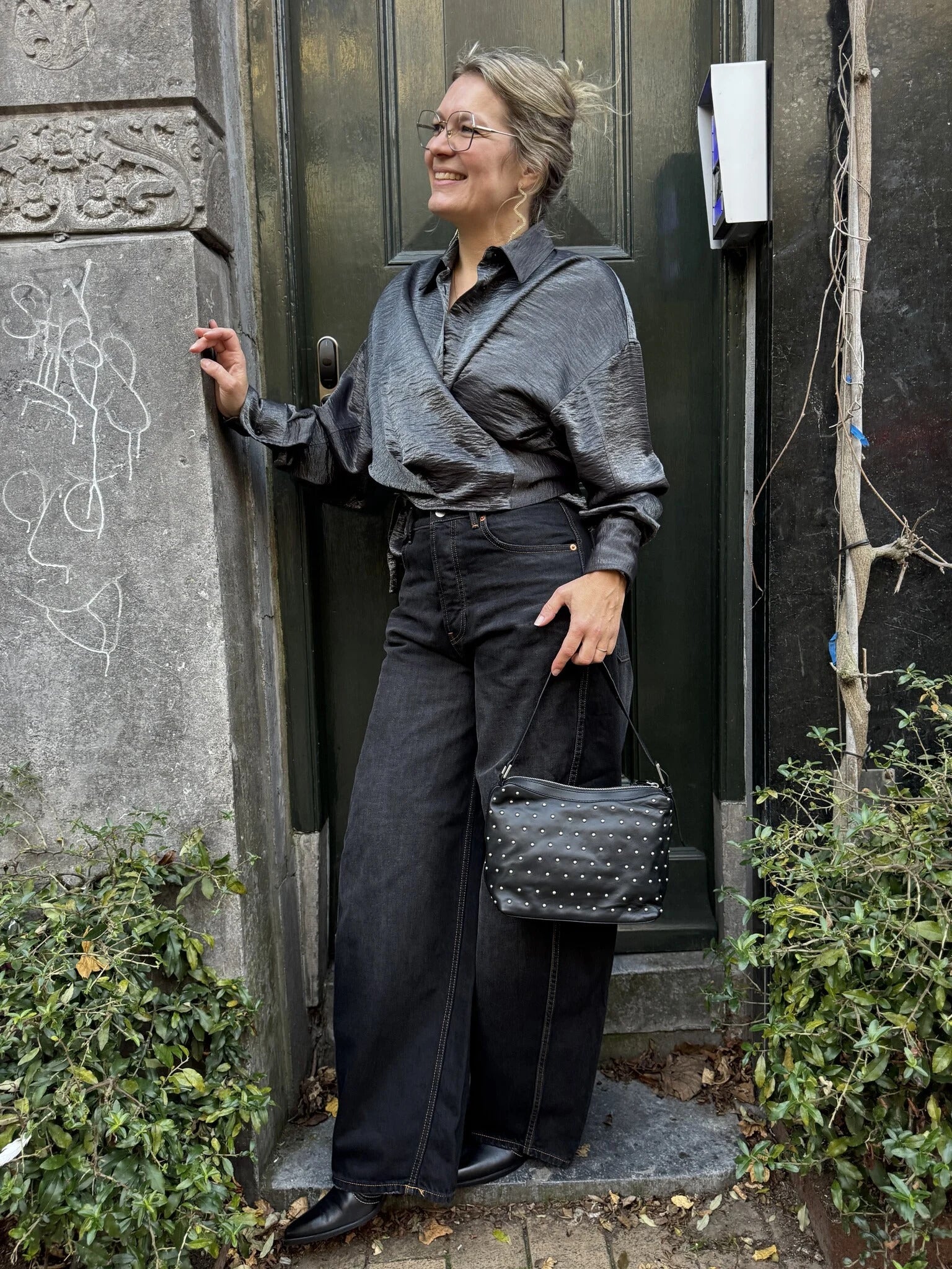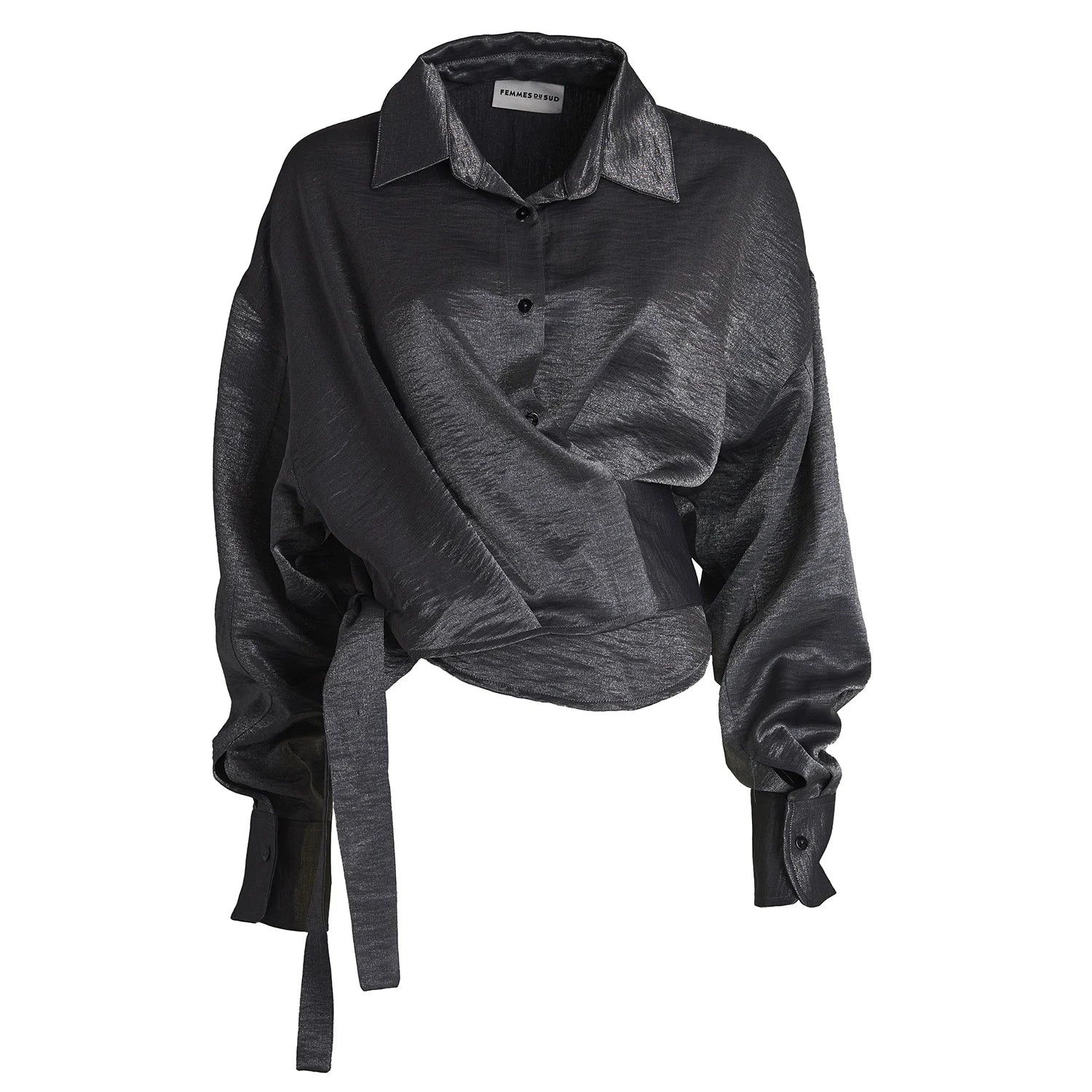 Elegancka bluzka o kopertowym kroju wykonana z delikatnie połyskującej satyny w kolorze ciemnoszarym. Luźny fason pięknie układa się na sylwetce, zapewniając komfort i styl przez cały dzień. Subtelna faktura materiału dodaje całości nowoczesnego charakteru. Bluzka świetnie sprawdzi się zarówno w stylizacjach casualowych, jak i bardziej eleganckich. To uniwersalny element garderoby, który łatwo dopasujesz do jeansów lub spódnicy.